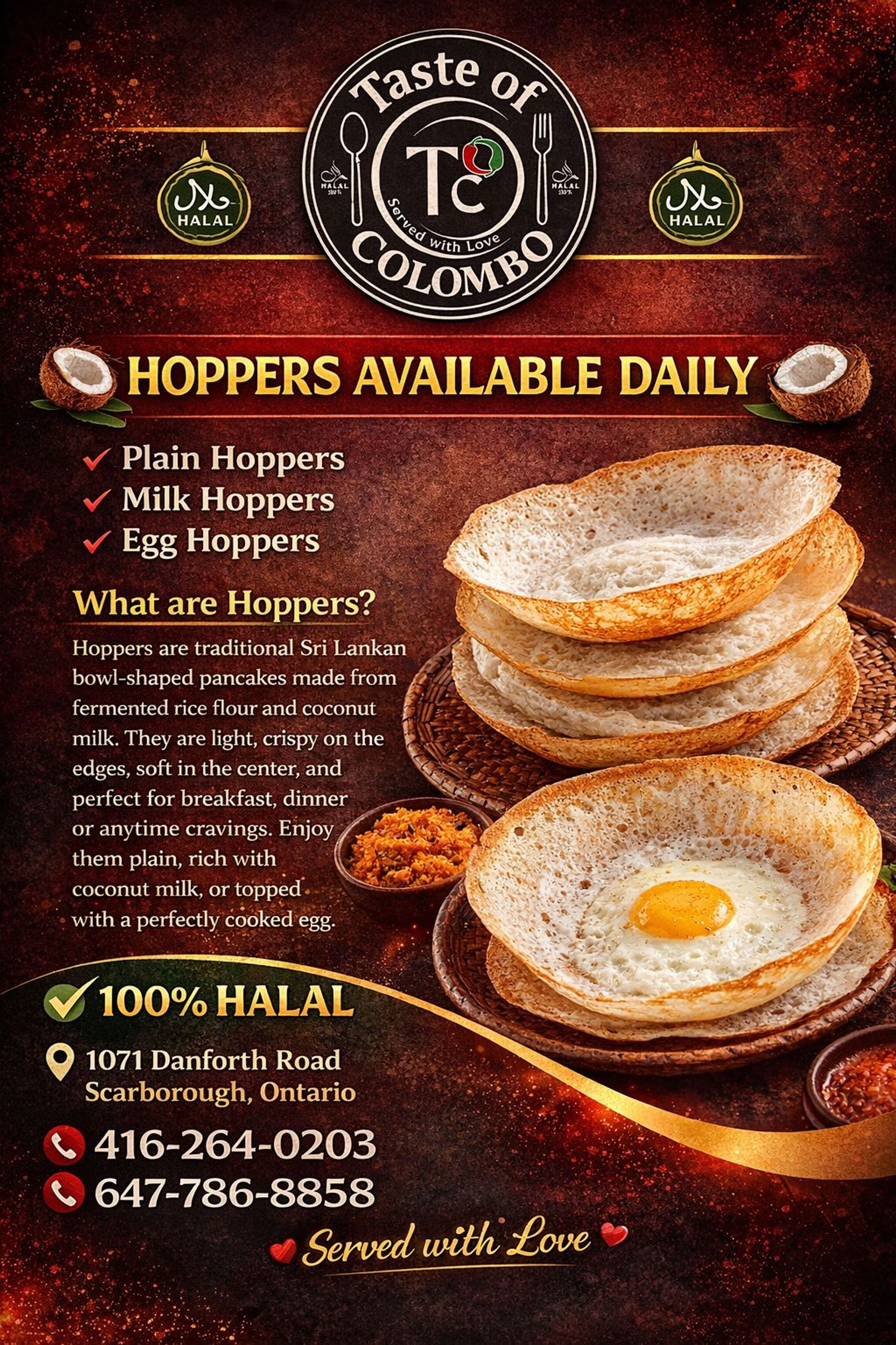 $7.99A traditional Sri Lankan dessert made with jaggery, coconut milk, eggs, and aromatic spices like cardamom, resulting in a rich and creamy pudding with a unique blend of flavors.